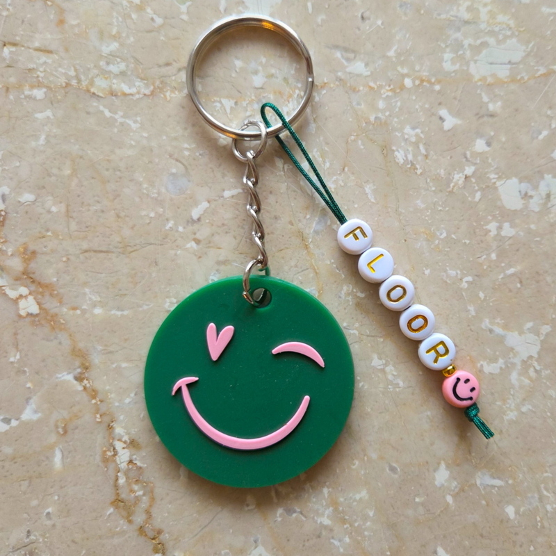 Sleutelhanger met smiley en kaartje, optioneel met naam.
