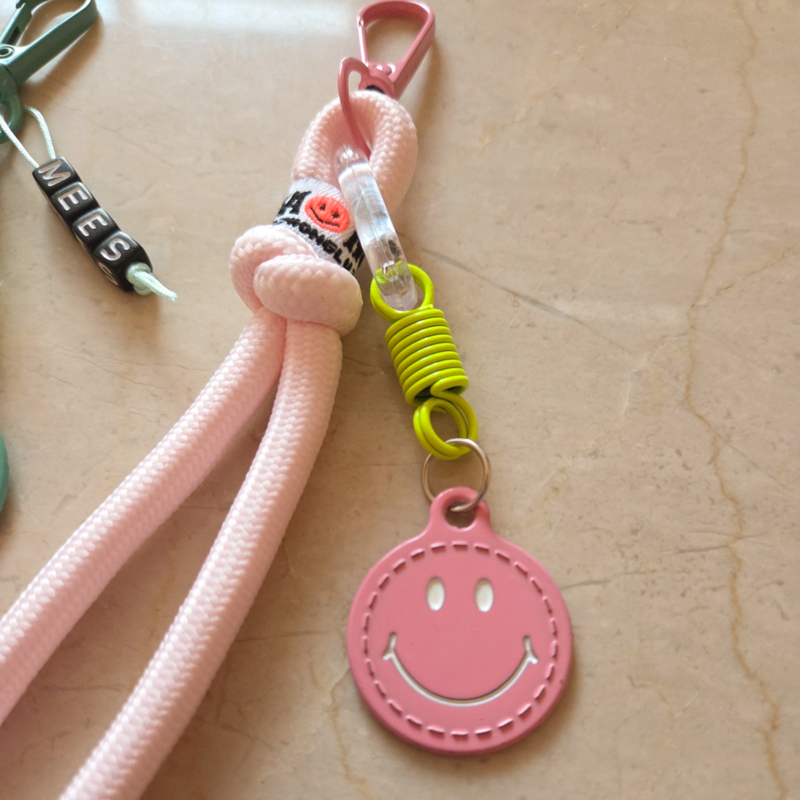 Stoere tassenhanger met gekleurd touw en een smiley bedel