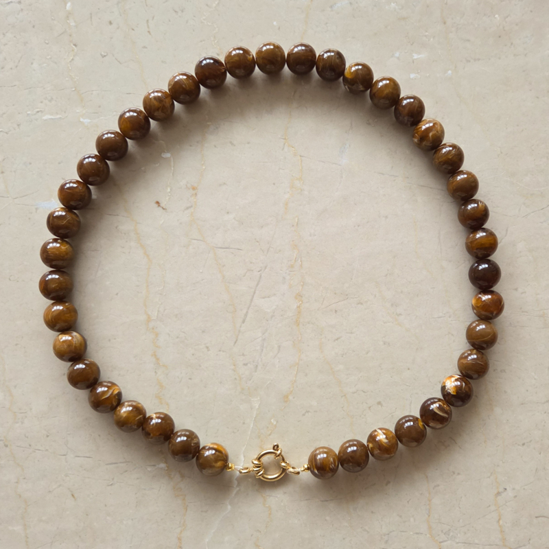 Leuke ketting met bruin gemêleerde ronde kralen en afgewerkt met een gouden slotje.