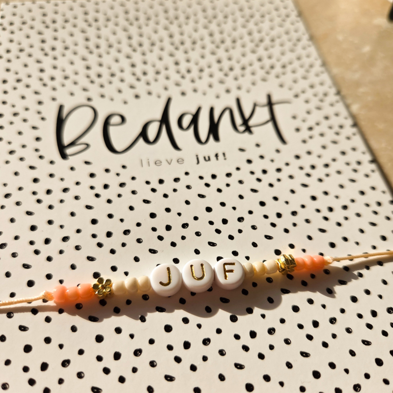 Kaart bedankt lieve juf & armbandje naar keuze