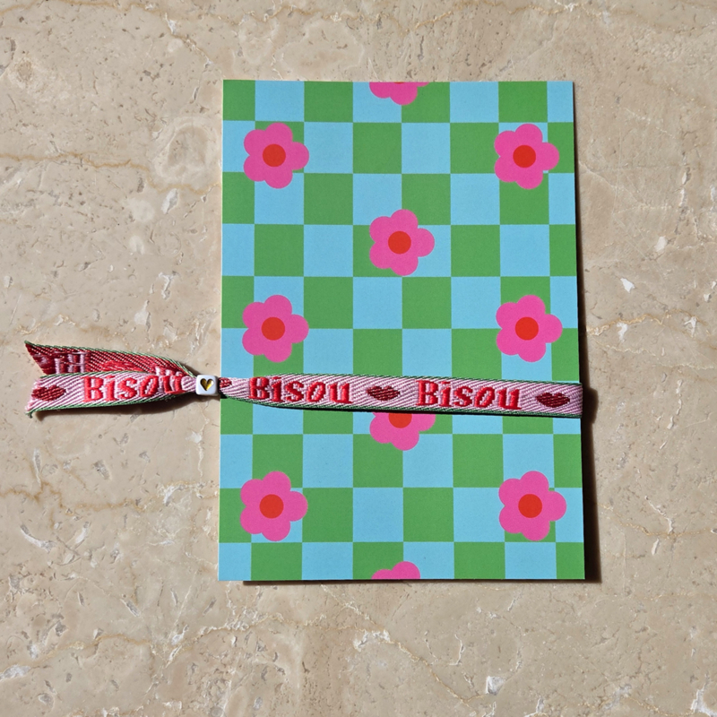 Vrolike kaart in A6 formaat om cadeau te doen aan iemand dierbaar. De kaart heeft groen en blauwe vierkantjes en roze bloemetjes. In het keuzemenu voeg je er een leuk armbandje bij! We pakken het als een cadeautje voor je in. Liever alleen de kaart? Dat kan ook! Dit kies je makkelijk tijdens het bestelproces (onderste keuze in de lijst)