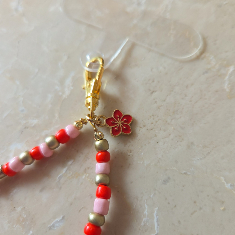 Telefoonkoord met pastel kralen in rood, roze en goudtinten